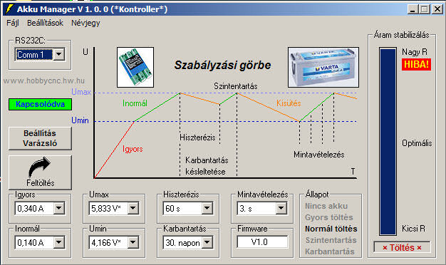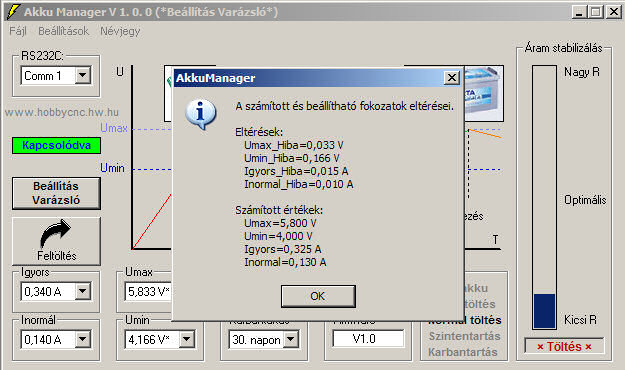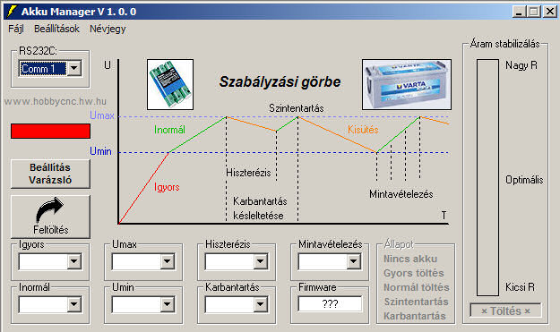 Áram stabilizálás: rákapcsolt akku esetén a gerjesztés nagyságát mutatja (más-más értékek lesznek Inormál é Igyors értékekre). Ideális esetben középtájt kell lennie a mutatónak (ügyeljünk arra, hogy mind két áramérték kényelmesen benne legyen a tartományban).