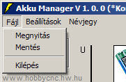 A program telepítése után az RS232C mezőben meg kell adni az Akku Manager csatlakozási helyét (COM1 v. COM2 v, COM...). Csatlakozatott Akku Manager esetén automatikusan felépíti a kapcsolatot.
