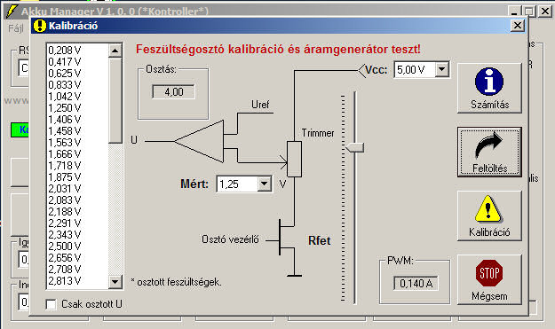 Ha a bal oldali feszültségek alján található "*osztott feszültségek." -ot kipipálja, csak az osztott feszültségeket fogja mutatni a program. Ha a csúszkát megfogva tologatja fel és le, a kiválasztott Vcc mező függvényében megkereshető (a feszültség lista alapján) az adott akkuhoz legjobban illeszkedő osztási arány (beállítható legyen az akku min és max feszültségei). A "Mért:" mezőben leolvasható az adott osztási arány és mért Vcc feszültségekhez tartozó, trimmer segítségével beállítandó teszt feszültség értéke (műszerrel mérve a tesztpont és a GND között)! A trimmert addig kell szabályozni, mígnem a tesztpont és a GND között a "Mért:" értéket nem mérjük. Ha a "Feltöltés" gombbal feltöltjük a beállított osztási arányt és a trimmerrel be is állítottuk ezt, akkor az Akku Manager és az AMS szinkronban fog működni. Csak ekkor garantált a beállított és a ténylegesen szabályzott szintek egyezősége!